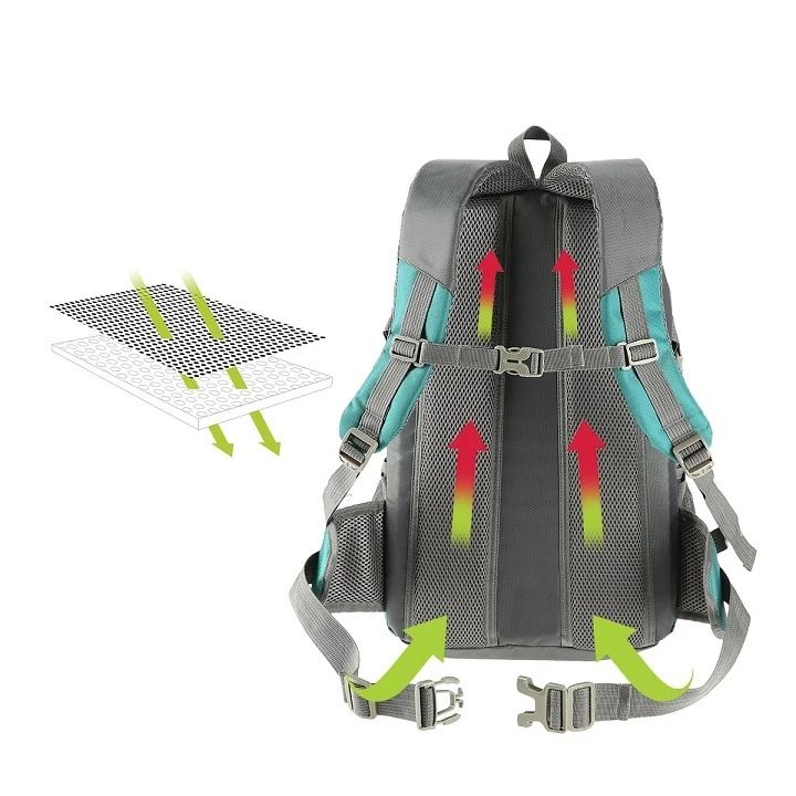 - das Rückenteil, die Schultergurte und der Hüftgurt sind mit speziellem Netz gesäumt, damit der Körper nicht direkt mit dem Material in Berührung kommt, was sich positiv auf die Durchblutung auswirkt und Schwitzen verhindert